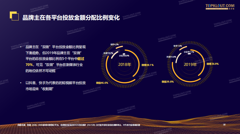 “双微”受到短视频平台极速发展的冲击,品牌主的投放金额分配比例均呈现下滑趋势,但品牌主在“双微”平台的总投放金额比例在5个平台中超过70%,可见“双微”平台在新媒体行业的地位依然不可动摇。