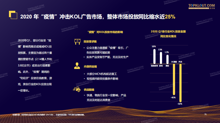 但是,疫情期间的 “宅经济”也促使在线教育、游戏等行业的KOL投放金额出现一定增长。