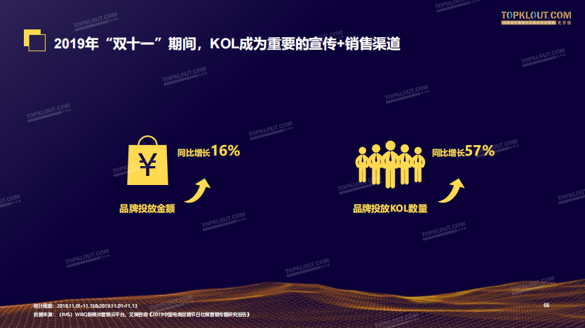 2019年“双十一”期间,KOL投放金额同比增长16%,投放数量同比增长57%,KOL成为品牌主在大型营销节重要的宣传和销售渠道。