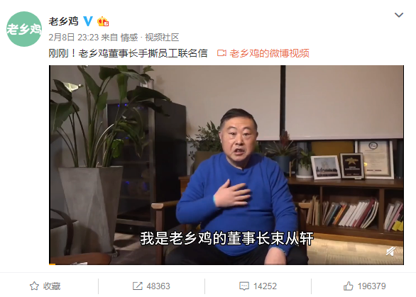 疫情期间,老乡鸡凭借着出色的营销成功出圈,最重要的一个动作就是CEO束从轩手撕员工联名信。