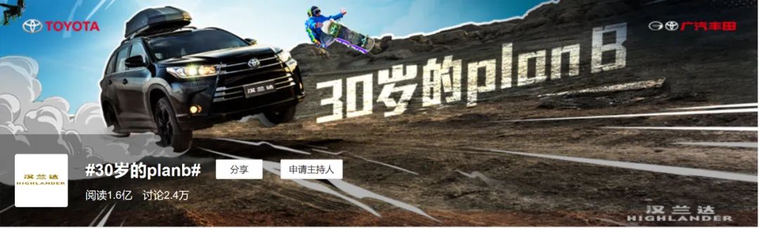 在90后迈入30岁的大关时,微博关于30岁的扎心话题不断,汉兰达顺势推出#30岁的planB#汇聚网友的吐槽与讨论,收获1.6亿阅读量;