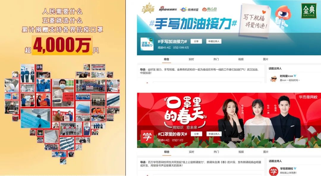 2020年有一个不同以往的开端,网友实时在微博关注着疫情的相关信息。从企业到个人也都尽己所能为抗疫出力。在这种时候,一些品牌的抗疫公益话题脱颖而出,得到网友自发的接力和转发。