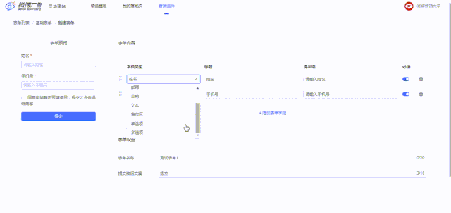 广告主在创建表单时可根据需求新建选项,设置必填或非必填,支持多种字段灵活搭配,还可自定义字段类型、标题和框内提示语,更换按钮的文案,全面提升表单的体验友好度与专业度。