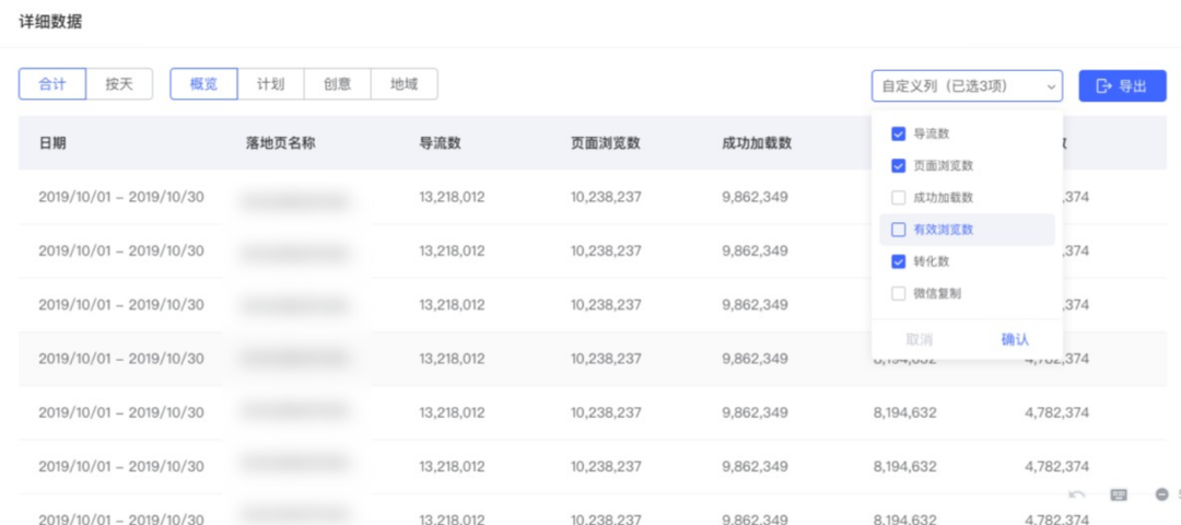 “数据管理页”的顶部将展示落地页的核心数据,便于广告主直观查阅各项指标;支持分天或分时段查看详细数据;同时也支持关联创意、关联计划,查看对应的详细数据。