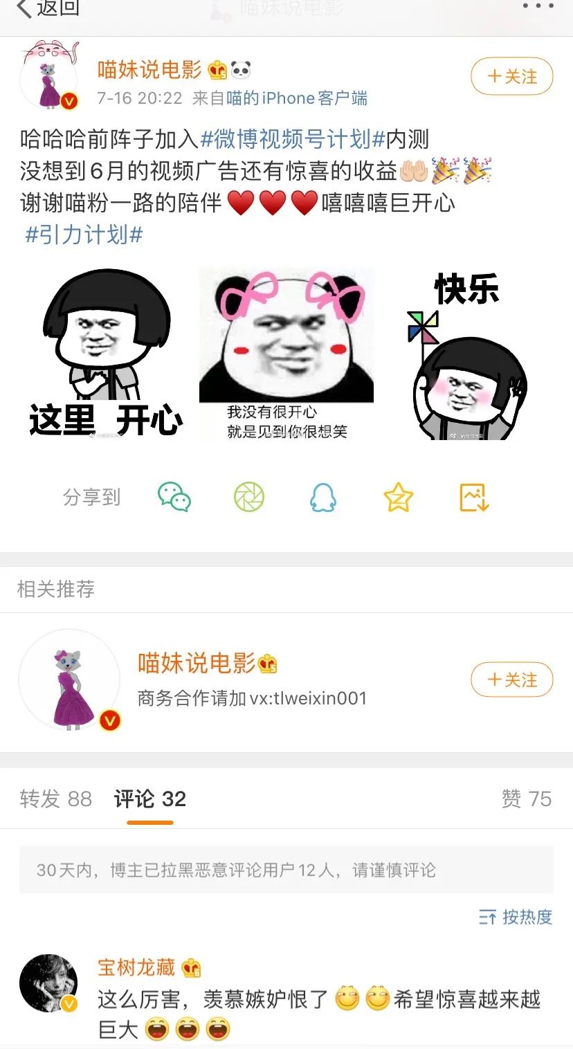 从这些扶持计划和产品升级中,我们可以看出微博在助力资深博主进一步完成爆火和扶持新晋潜力博主,使其快速成长,产出爆款视频的决心。