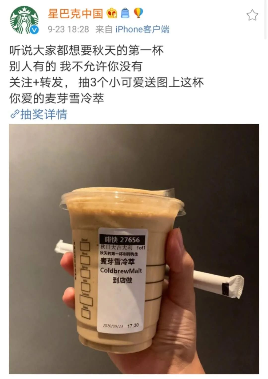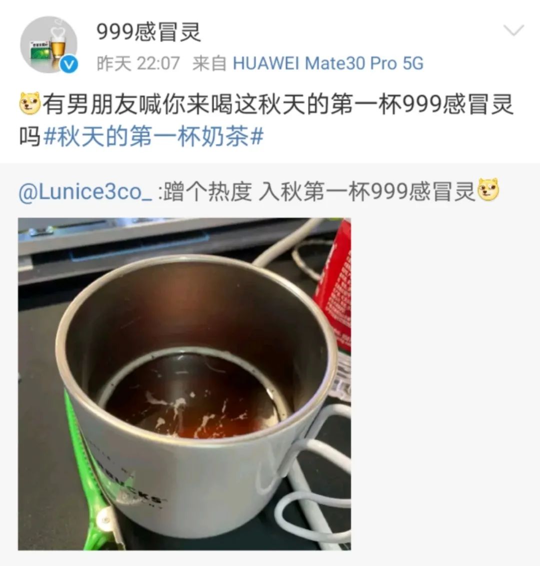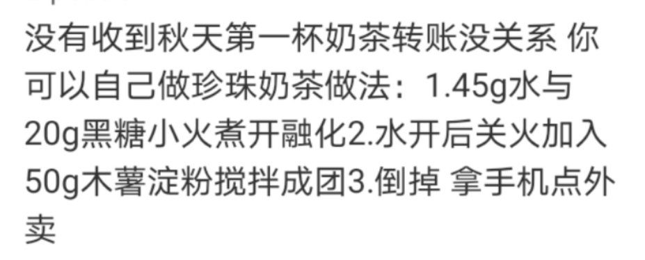 其实就还蛮莫名其妙的,起源于一个要红包的借口,要到了后顺便秀个恩爱,网友看到了就看热闹的跟个风,最后传播越来越广,热度越来越高。这杯奶茶人传人传人传人,最后在昨天下午实现了,全网都喝“秋天的第一杯奶茶”成就
