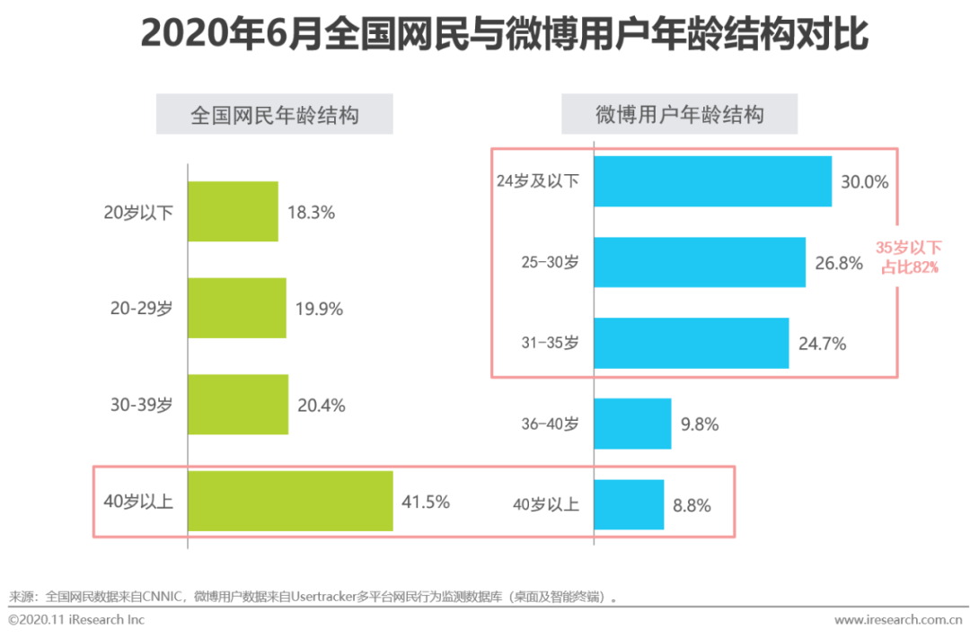 CNNIC最新公布的第46次《中国互联网络发展状况统计报告》数据显示,截至2020年6月,我国40岁以下网民占比为58.6%,以95后为核心的学生用户群体占比达到23.7%。对比全国网民年龄结构,微博用户整体较为年轻。艾瑞Usertracker多平台网民行为监测数据显示,截至2020年9月,微博移动端35岁以下用户占比达82%,出生于1995年后的Z世代用户占比达到30%。伴随微博多年的发展,新老用户迭代在所难免。可以看出,一方面,部分曾经年龄在20到30岁左右、高度活跃的老用户产生了不可避免的流失,而另一方面,更多当代年轻用户涌入微博,使平台整体用户年龄依然保持年轻,反映出微博对年轻用户持续的吸引力和独特价值。