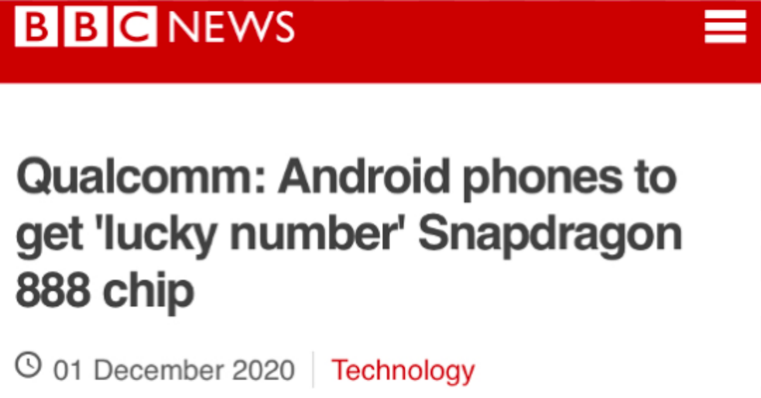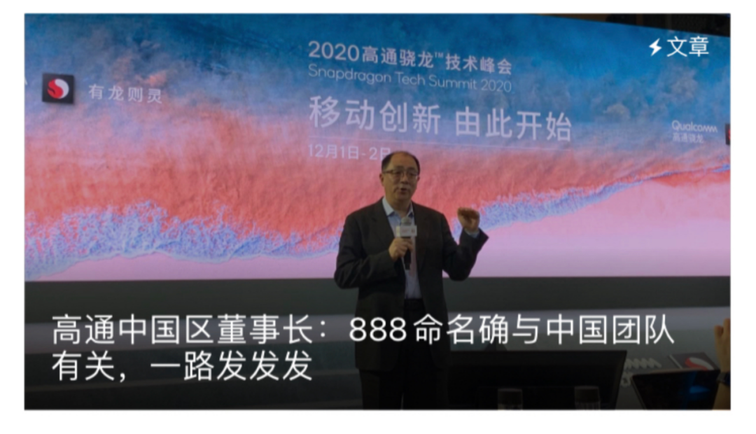 “嗅觉”敏锐的BBC新闻首先对骁龙888以中国幸运数字命名骁龙旗舰移动平台做了报道。高通官方随后对此也大方承认,高通中国区董事长孟樸在骁龙技术峰会后的采访中表示:“骁龙888的命名确实跟中国团队有关系,也听取了很多中国厂商的意见。骁龙888力图去体现高通中国取得的优异成绩,希望全球都沾沾中国的喜气,一路发发发。”