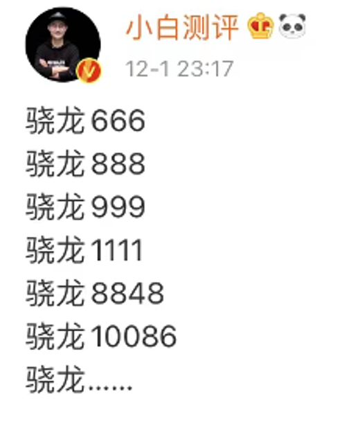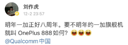 手机界大佬KOL们也没有放过这个带节奏的好机会,纷纷展示段子手和脱口秀“技能包”,将自家产品与骁龙888关联。一加手机创始人@刘作虎调侃一加明年搭载骁龙888的旗舰机要不要叫OnePlus888。Redmi品牌总经理@卢伟冰则补刀各大厂商官宣,挑刺“首发和首批还是有很大区别的”。