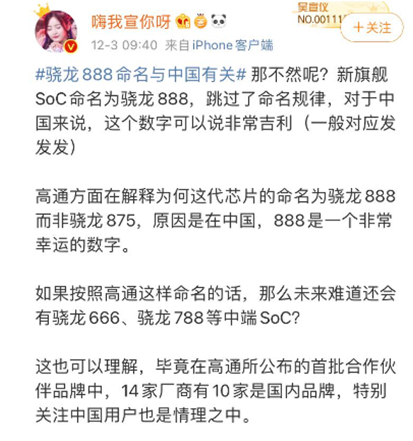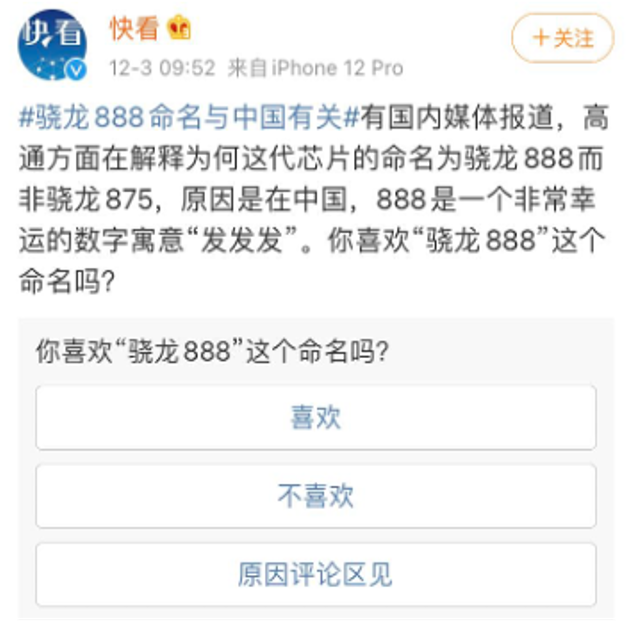 经过品牌蓝V和大佬KOL在微博生态下的双重助推,骁龙888的热度迅速升温,话题#骁龙888#在发布会第二天即登上微博热搜榜Top10,话题#骁龙888命名与中国有关#也在受到了广泛热议。