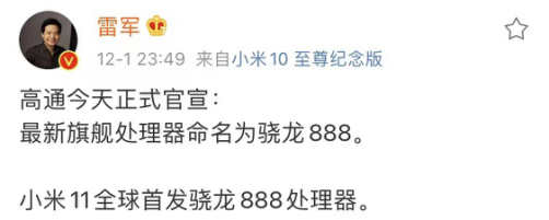 没错,依然是那个男人——雷布斯!在骁龙888发布的第一时间,小米创始人、董事长兼CEO@雷军就在微博高调认领了小米对骁龙888的全球首发权,并且在一天内多次发声,以开箱谍照、评论抽奖、互动投票等方式与海量米粉积极互动,将未来的旗舰机小米11与骁龙888捆绑,再次成为了“科技圈最靓的仔”。
