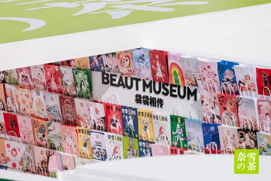 就好像在线下快闪店“美好博物馆” 展区,奈雪展览的五年中创作的100余款独具特色的手提袋。