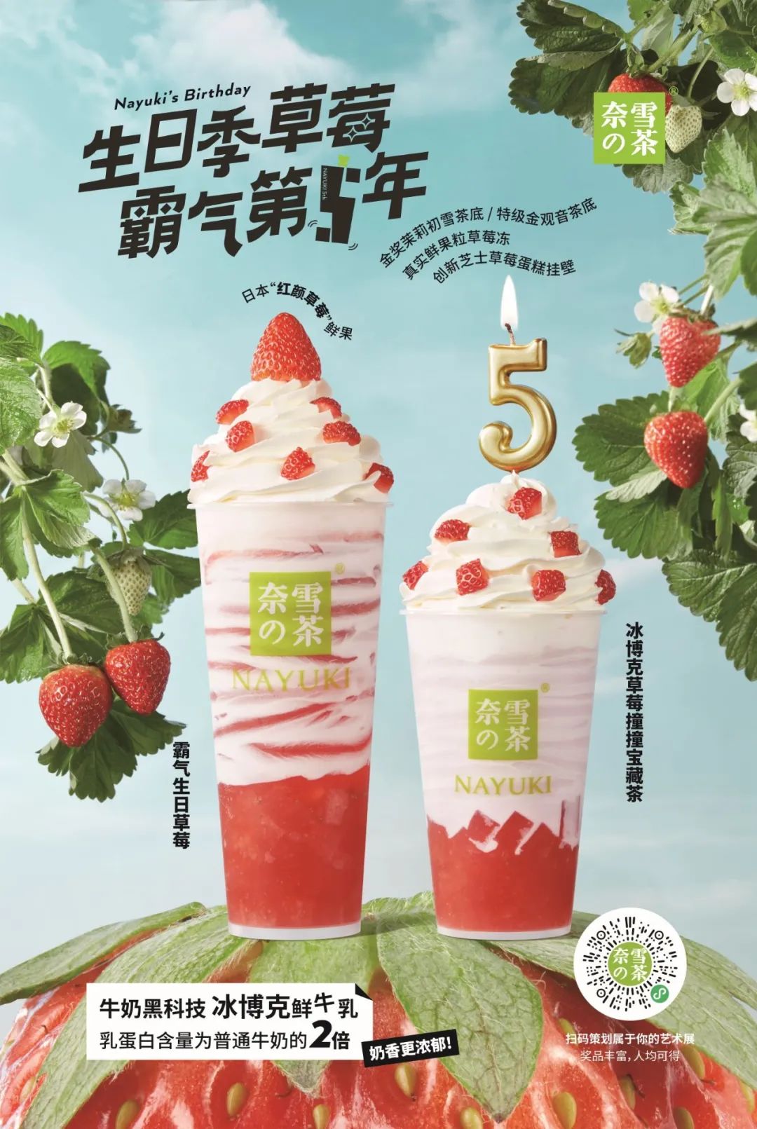 此次127生日季,为了回馈消费者的支持,奈雪便推出了“美飒兼具”的王炸爆款新品:霸气生日草莓和冰博克草莓撞撞宝藏茶。