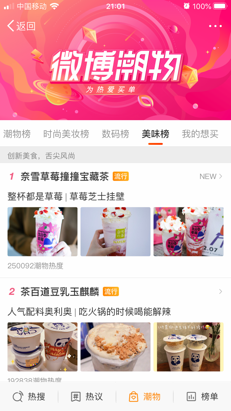 升级的颜值,升级的吃法,可以看到的是,奈雪正在开拓产品的多元化价值,让每一杯茶饮,不仅好喝,而且好看、好玩,赋予产品更多的内在附加值,多维度地拓宽年轻人对奈雪产品的想象力,不断给消费者带来惊喜体验。奈雪草莓撞撞宝藏茶更是登上微博潮物榜的榜首,热度高达25w。