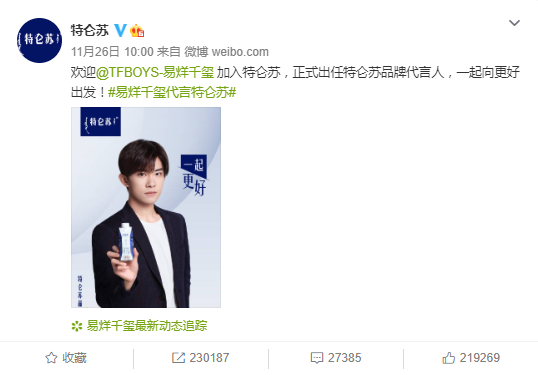值得一提的是,依托流量明星强大的影响力,#易烊千玺代言特仑苏#话题讨论量近60万,而阅读量更是高达2.3亿,形成话题传播上的燎原之势。