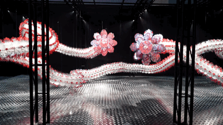 新锐装置艺术家陈粉丸《无限之花》,层层叠叠的剪纸将方与圆交织在一起,传统与时尚相结合,表现出腾空的无限之花。
