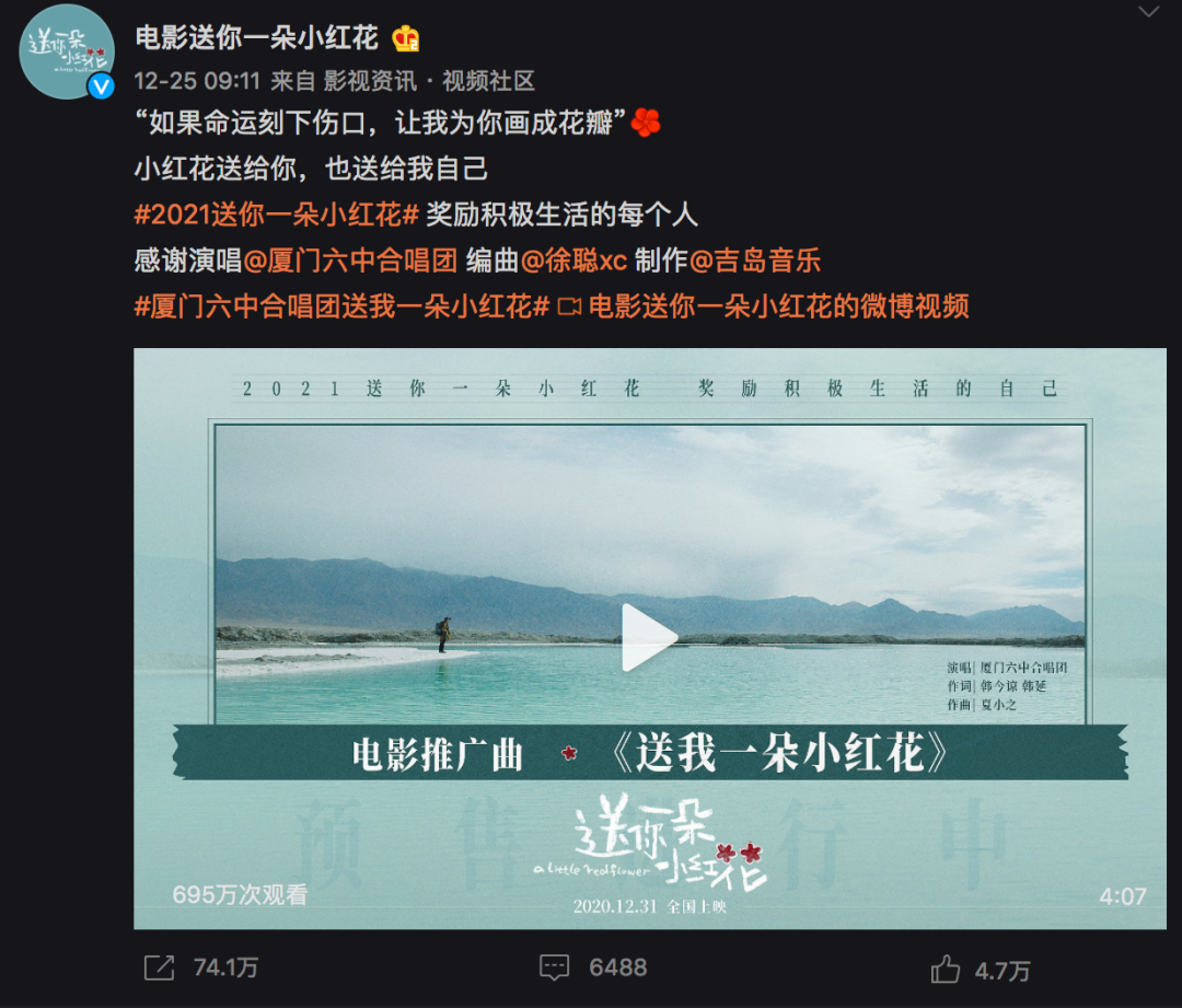 由厦门六中合唱团演唱的《送你一朵小红花》推广曲在微博首发后引发轰动效应,仅官博单条微博就被转发超过74.1万次,素人作品效果不亚于顶流明星单曲。人民日报官微也发布了这支歌曲的MV,传递“用力珍惜,积极生活”的正能量。
