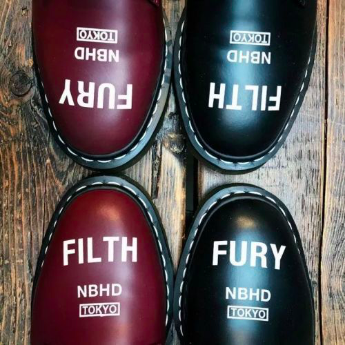 除了显眼的大标志,还有代表价值观的slogan。NBHD 的招牌 slogan “The Filth and the Fury”。它与知名皮靴品牌 Dr. Martens 的联名系列单品中,就将Slogan作为符号加在了鞋头上。