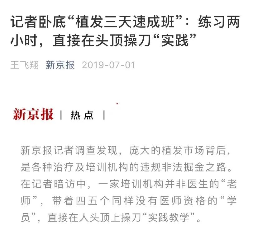 而在植发行业,问题更多出现在植发机构资质不明和植发价格没有统一标准上。由于执法行业的高营收,越来越多没有专业资质的人入局植发行业,部分植发机构的医生甚至没有取得专业资质就上手为消费者植发,“三天速成”、“拿活人练手”等乱象频出。