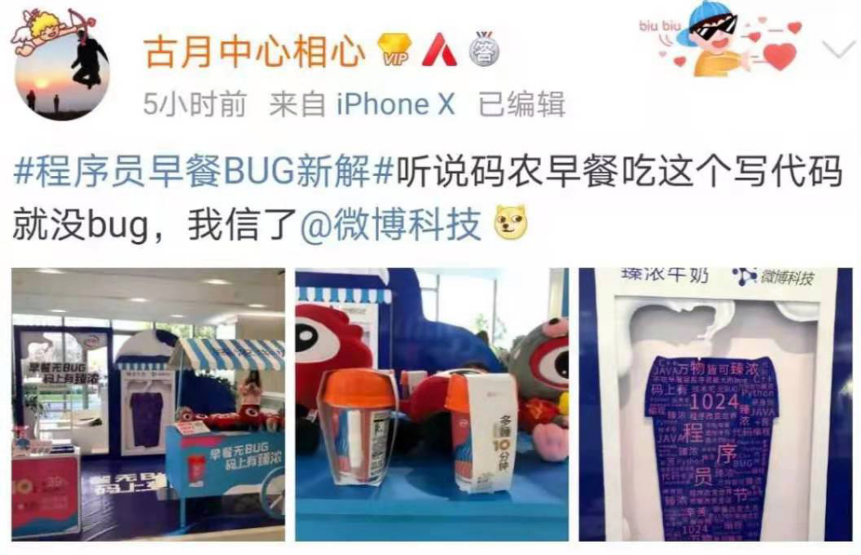 这点伊利臻浓做出了突破,10月24日是程序员日,其选择在我浪总部发起早餐杯新品派发活动,关爱程序员打工人,并同步在微博上线话题#程序员早餐BUG新解#,用代码“表白”程序大大,引发各路网红达人倾吐心声、自嘲感慨,花式推荐“喝臻浓,虽然不能让头发多一点,但至少可以活得久一点”。
