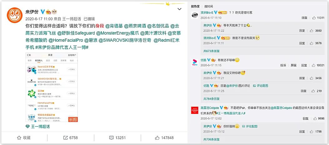 02 “共享代言人别担心,品牌可组CP形成叠加效应”,明星一般代言多个品牌,以王一博来说,2020年就代言了29个品牌,与其一争高低,不如联合出击。就拿其中非常擅长“社交”的@来伊份 来说,先是官V主动关注其他代言品牌,并调皮求回关,引发了一阵品牌CP的热潮。