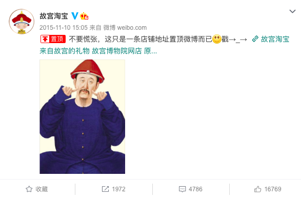 @故宫淘宝 一条店铺置顶微博,语言简洁又有趣,网友在评论区里面回复这个表情i了i了。当你看到古人用现代的方式卖起萌来,这种反差让用户感觉到好玩,有趣,自然而然就拉近了与用户的距离。