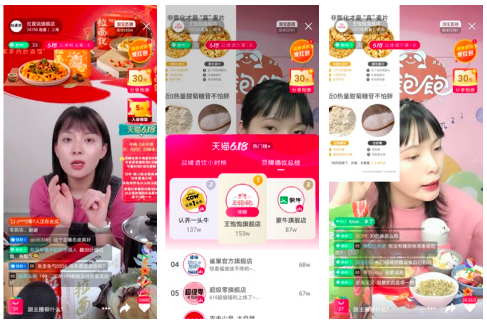 新品牌启动初期依靠具有流量的网红主播直播卖货,最有名的案例,花西子和李佳琦的捆绑已经人尽皆知;除此之外,品牌也开始自播,甚至CEO亲自上阵。据淘榜单发布的《2020年商家直播白皮书》2019年,超过50%的品牌商家通过直播获得了新增长,且与达人直播较强的头部效应不同,自播商家的增长更加平均,腰部商家的直播渗透率提升最快。拉面说、王饱饱是第一批开始做自播的商家,单场观看人数2w左右。618期间,王饱饱获得类目店铺直播小时榜第一。