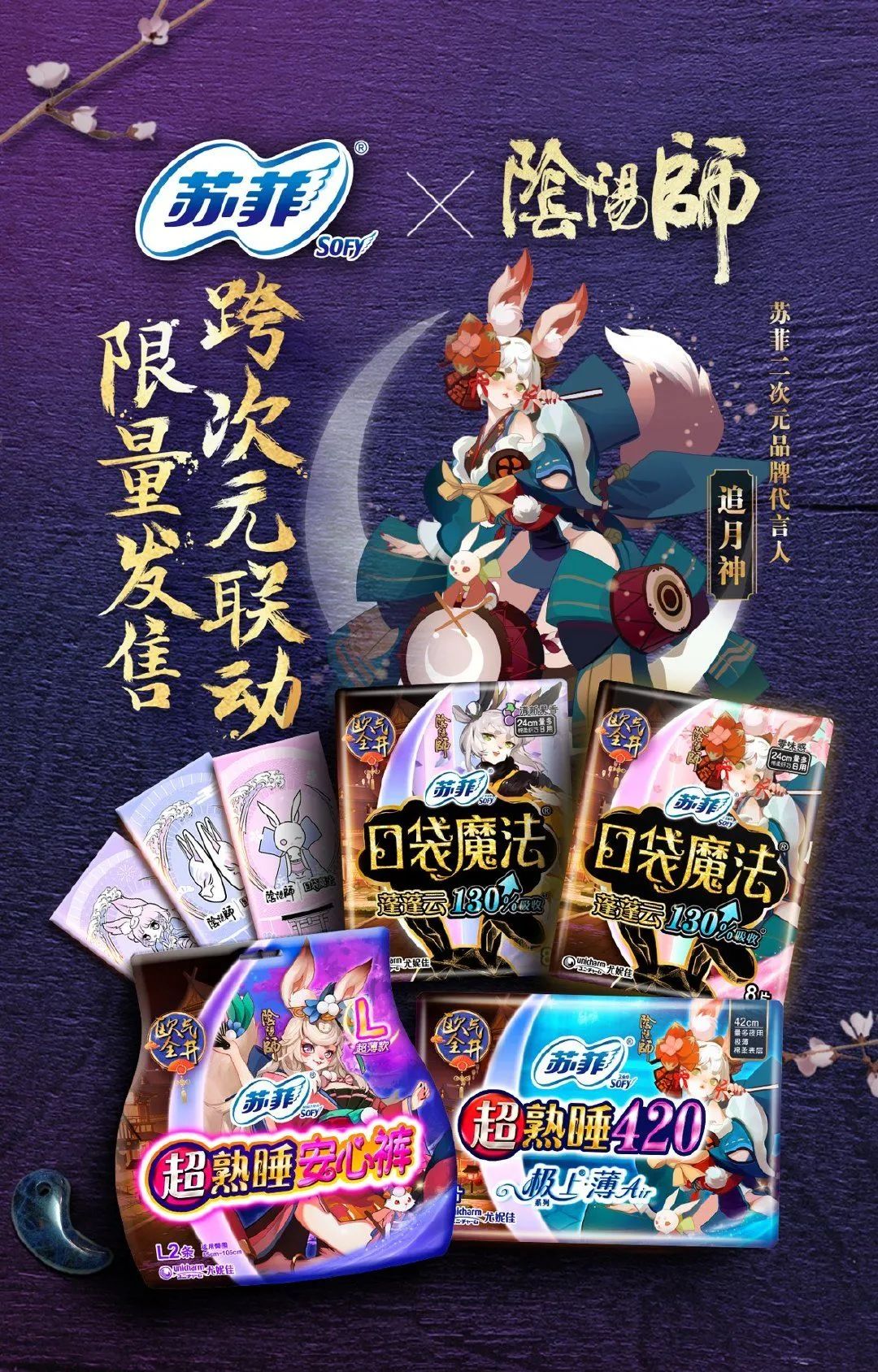 品牌联名案例也是不胜枚举。比如HFP x 单向街,大白兔 x气味图书馆,喜茶x多芬,故宫 x 润百颜、完美日记的联名款更是多的去了... 我们举一个2020年联名社交声量比较高的案例,苏菲X阴阳师,一次跨次元的联动,创造了“联名+二次元代言”的双重模式,将少女感的苏菲带到了游戏圈。