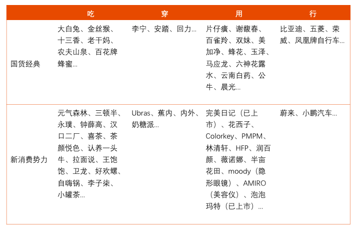 所以我们在2020年既看到老牌国货的玩出圈,也看到了大量新品牌一鸣惊人。梳理一下,从纵向时间线的维度可以分为两大类:以国潮新贵代表的“新消费势力”和以国货经典为代表的“国民回忆”。从横向生活线的角度,可以分为“吃“、”穿“、”用“、”行”,各有各的潮。
