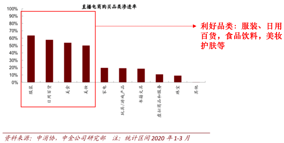 “全民网红、全民直播”推动直播电商高速发展。2019年,淘宝直播的日均观看用户数同比增长超过150%,每天观看时长超过1小时的用户同比增长40% 。2020年疫情加剧这一趋势,开启全民直播带货。CEO、明星纷纷下场,摇身变成带货主播。从直播电商的渗透率可以看出,促进了服装、日用百货、食品饮料、美妆护肤等行业的发展。