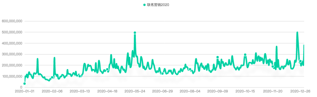 从短期来看,联名营销和明星代言,是快速提升影响力的品牌抓手。无论是明星还是联名,都可以和品牌形成1+1>2的效果。如何利用明星的影响力,玩转粉丝经济,快速出圈,已经有非常多的品牌案例,比如百雀羚X周杰伦X王一博,极大的发挥了明星爱豆的影响力,我们在这里就不详细展开。今天着重看下联名营销,我们去跑了一下微博上2020年关于联名营销的关键词,可以看到表现突出,总声量650亿+,最高声量达到5亿+。