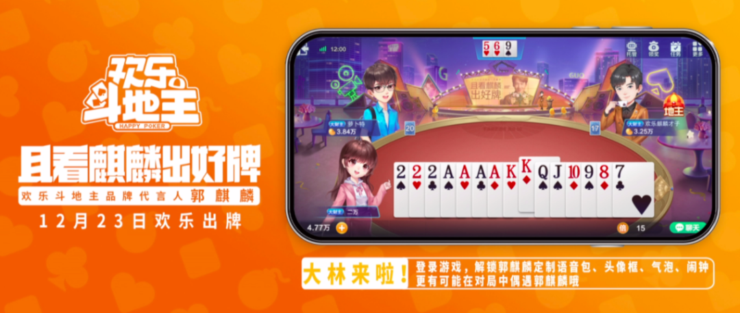 是不同于其他品牌代言人的“空降属性”,郭麒麟在现实生活中本身就很喜欢玩《欢乐斗地主》的游戏,还曾在某档综艺节目里说过想开一家斗地主俱乐部,娱乐之余,也是为了让孤独的中老年人有个好去处——而欢乐斗地主所具备的全民属性,就是可以帮助更多的人聚在一起,碰撞出生活的乐趣。