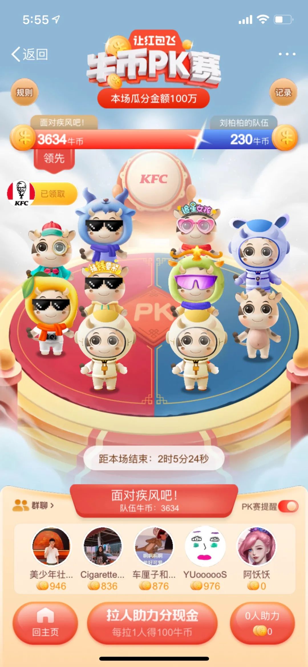 #牛币PK赛#是由两队进行PK,每队由3-5人组成,截至当天晚上20:00,牛币多的一队胜出,参与瓜分当日100万元红包。获取牛币的方式主要有:参与队员的福牛等级、邀请好友助力、完成品牌专场任务等。PK赛激起了不少网友的胜负欲,甚至让多年不联系的朋友因为需要助力人气而复联。