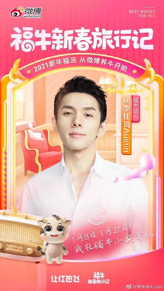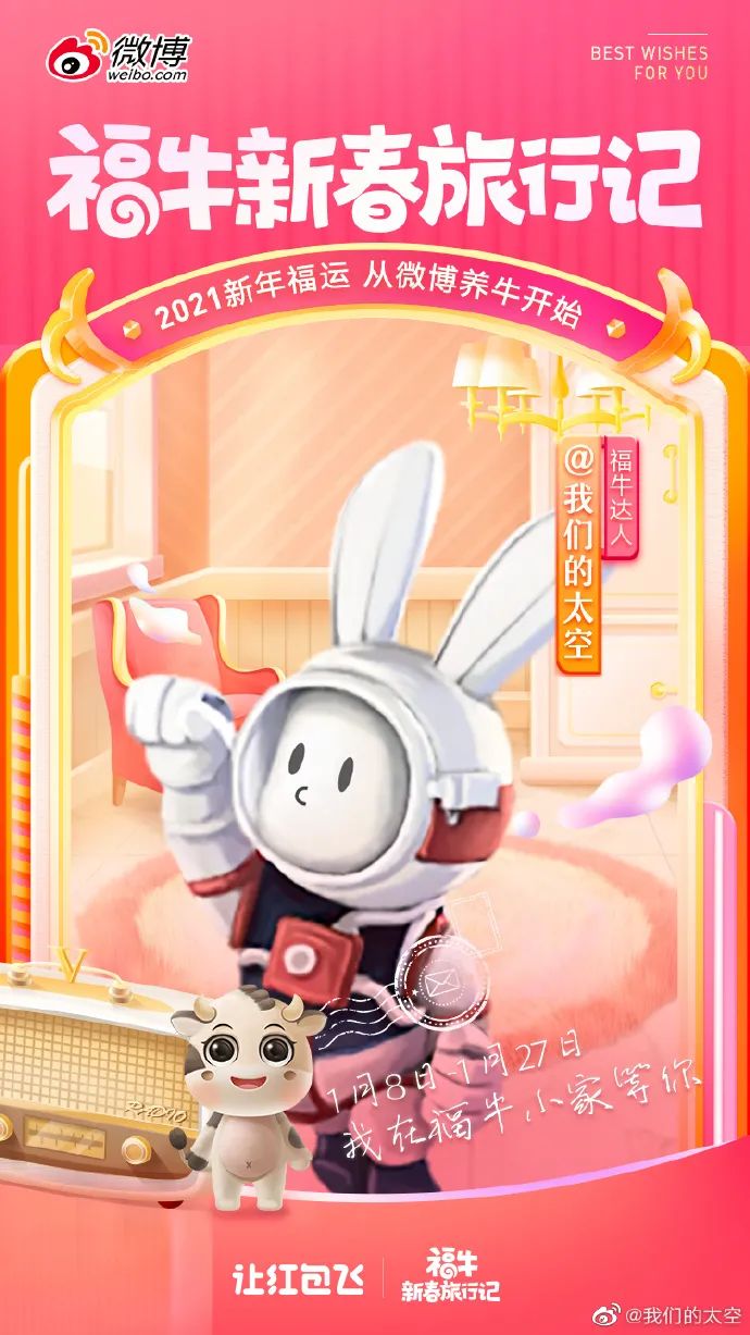 #福牛新春旅行记#是微博一年一度品牌活动#让红包飞#项目2021牛年的专属款,从1月8日开始到1月27日结束,第二阶段(1月28日~2月11日)将由“新春集福牛”接棒,全程为期35天。
