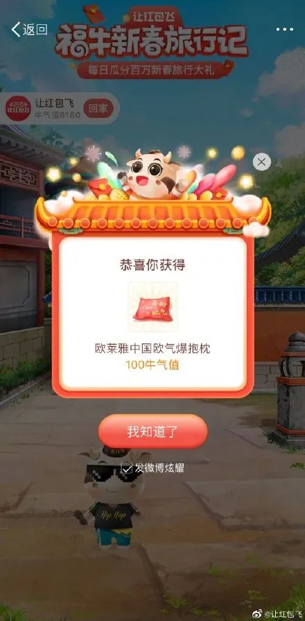 二是在到处旅行过程中,还能获得不少特殊道具,如“万物皆可五菱”@五菱汽车 的宏光MINIEV挂件;@京东 的吉祥物京东小JOY;即使放假了学习也不能松懈的@学而思网校 的爱豆猴;@肯德基 的KFC镇宅福堡;以及“欧爷”@欧莱雅中国 送给大家的欧气爆抱枕……一举满足了网友的收集控。