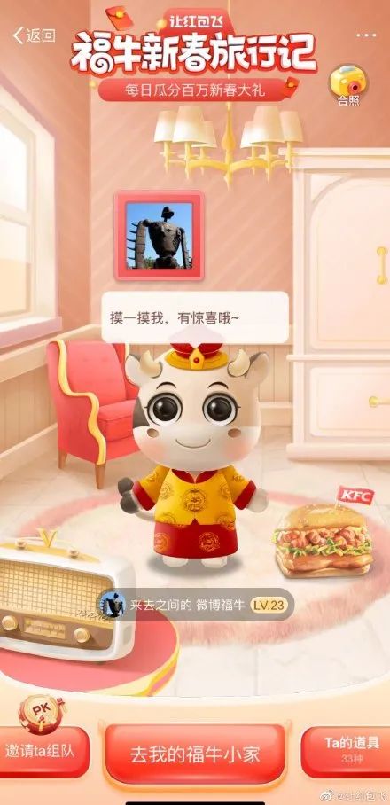 如果养成游戏、PK赛还是以往比较传统的玩法,主要基于自己的私域关系,那么#福牛新春旅行记#则开创了一种拓展公域社交的新模式,而连接的桥梁则是明星、KOL与品牌方。