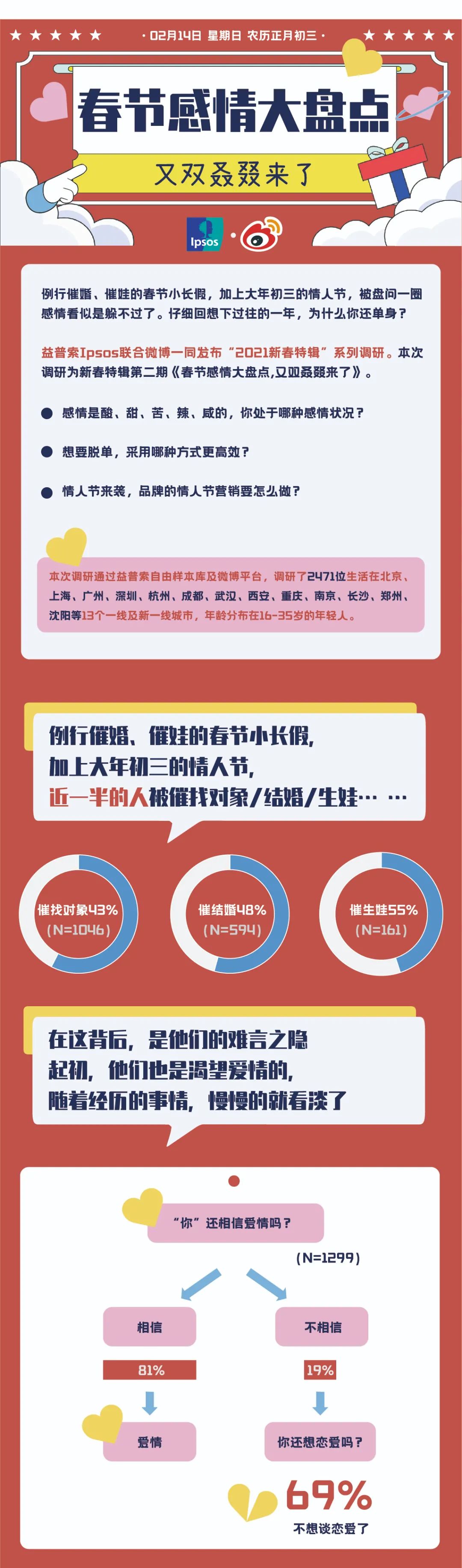 微博联合益普索Ipsos 一同发布“2021新春特辑”系列调研,第二期《春节感情大盘点,又双叒叕来了!》聚焦年轻人的情感生活——