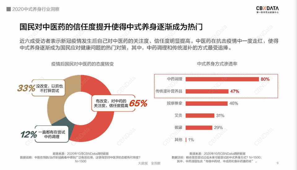 CBN数据显示,在诸多中式养身的方式中,中药调理渗透率高达80%,其次传统滋补营养品渗透率达47%,成为大众最为追捧的养身方式。