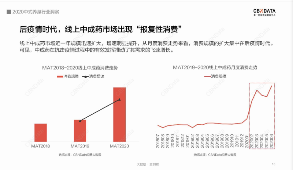 后疫情时代,线上药店APP和养生保健类专卖店,以及综合类电商平台的中成药销量飞速发展,消费规模可达报复性消费级别。