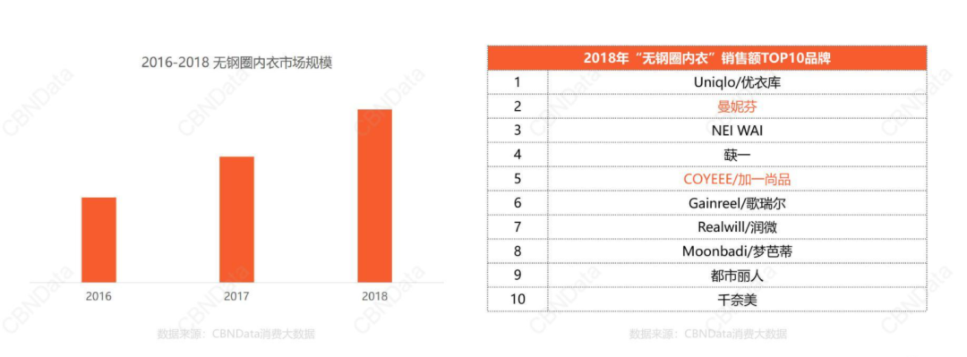 内衣产品由传统的聚拢、上托型,向减轻束缚的无钢圈内衣发展。第一财经商业数据中心(CBNData)联合天猫内衣发布的《内衣行业趋势研究》显示,近年来无钢圈文胸市场保持稳定增长,2017年市场增速接近五成。而轻薄透气、无钢圈、无胸垫的Bralette作为更细分的新兴品类,2016年迎来爆发式增长,2018年消费增速达172%。