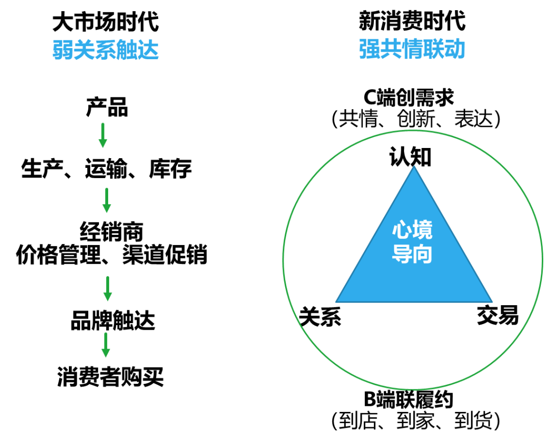 大市场时代是产品导向、渠道为王,标准增长公式为国民化大单品+洗脑化大传播+压货式大分销+流量式大出货,本质商业逻辑是供给重于需求、货找人的弱关系触达。