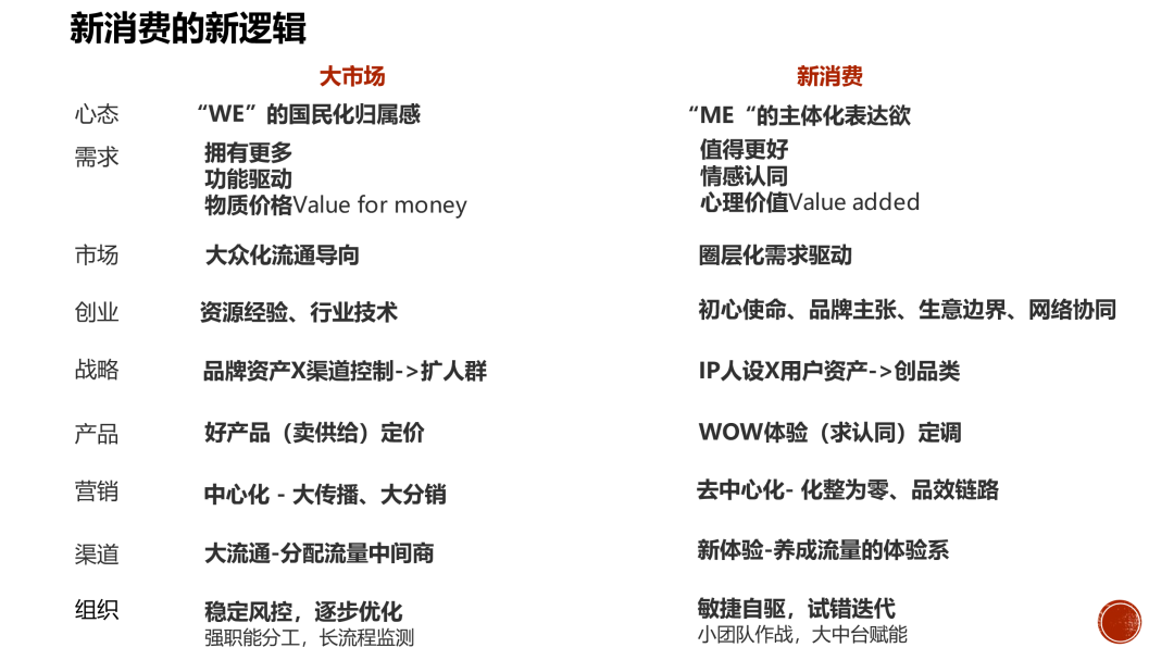 而圈层化是完全不同于大众化的一个全新的市场结构,从而也形成了新消费“从心出发”的新商业逻辑。