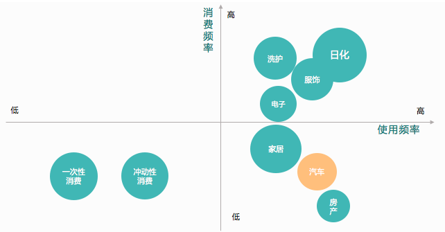以消费频率和使用频率的维度,所有的消费品可以分为三大类:高频使用高频消费类,如洗发水牙膏等日化洗护产品,日用消耗品;高频使用低频消费类,如汽车、房产等就属于使用频率高,购置频率低;低频使用低频购买类,这类具有一次性消费和冲动性消费的特点,比如一年泡一次的浴缸,半年用一次的早餐机等等。