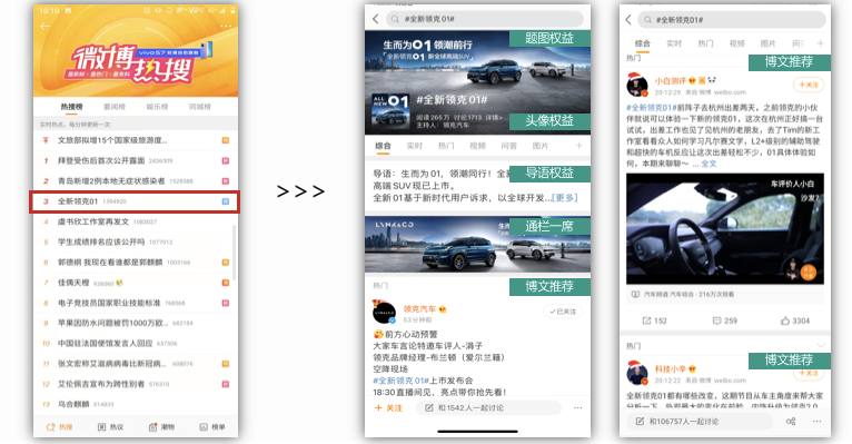 我们拿微博上发生的案例来举例。20年12月领克01 (配置|询价)全球版上市,就是一个通过上市营销让用户从Aware 转化到 Ask,并最终转化到Act,“动力臂去撬动阻力臂”的营销模型。本次项目分了三步走:品牌曝光-车型曝光-线索转化。