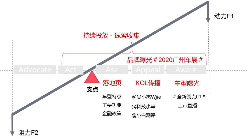我们将“消费者的营销决策5A模型” 结合“杠杆原理”进一步分析,如何找到影响消费者决策的“支点”。根据杠杆原理,有几个关键因素:如下图所示 L1 叫做“动力臂”对应:Aware-Appeal-Ask;F1为“动力”对应:品牌势能;L2为“阻力臂”对应:Act-Advocate,F2是“阻力”对应:影响力、销量、市场占有率。我们根据杠杆原理公式F1*L1=F2*L2,可以得出如下的结论:总量不变下,动力臂大于阻力臂,省力,反之则费力,即用品牌蓄力去撬动更大的营销势能;其二,调节动力臂系数,扩大整个盘子的总量。