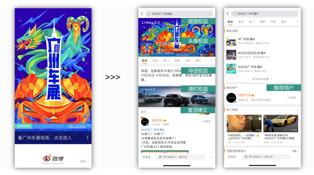 首先,通过绑定车展IP进行品牌曝光,为车型曝光做铺垫。领克汽车品牌绑定广州车展官方IP#2020广州车展#,在话题页面导语、题图、头像、通栏等位置进行了品牌曝光,并通过置顶博文和推荐用户将关心车展的用户引流到品牌的关注。官方话题阅读量达到了6.5亿, 讨论量20.1万。