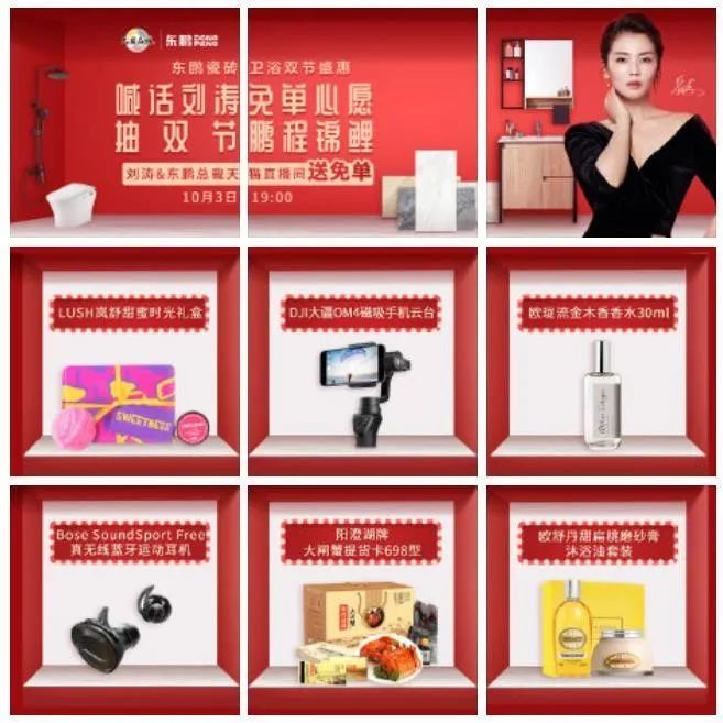 2020年东鹏瓷砖的代言人@刘涛tamia多次在天猫化身带货主播刘一刀向多个品牌砍价进行直播带货,取得了不俗的成绩。于是9月东鹏瓷砖在微博展开一系列明星营销,为10月的东鹏瓷砖双节直播大促蓄水,随着相关话题热度飙升,10月3日东鹏瓷砖直播带货迅速出圈,当天的直播观看量将近200万,打破了东鹏直播史上最高的观看记录。