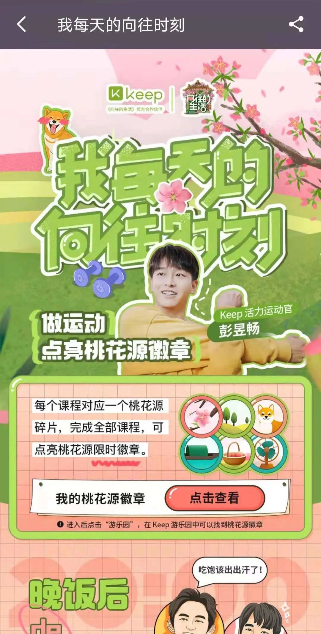 Keep想要走向全民化,那么借势国民综艺、明星的影响力无疑是一个事半功倍的选择。《向往的生活》几季以来话题度和收视率都居高不下,是当之无愧的国民综艺;常驻嘉宾彭昱畅是最具国民度的90后演员明星之一,年轻、有实力、路人缘好,网友对其身材的关注也与Keep完美契合。