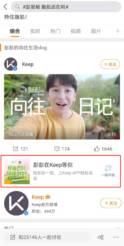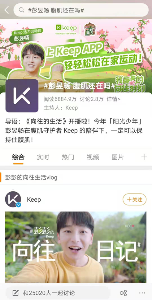 除了在微博发布综艺片段引发用户关注互动外,Keep还借助彭昱畅的明星影响力进一步覆盖了用户浏览路径,吸引更多用户关注相关话题。