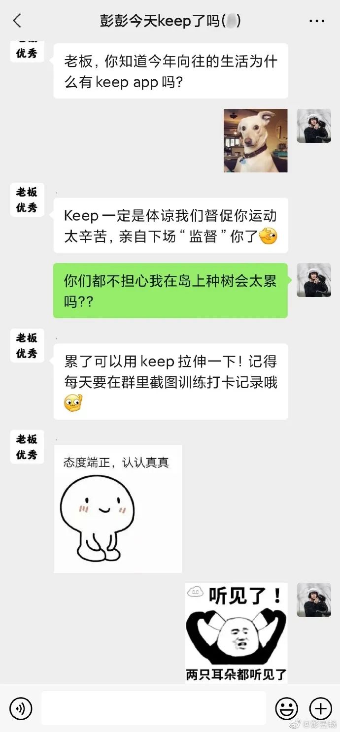 彭昱畅在节目开播后晒出了群名为“彭彭今天Keep了吗”的聊天记录,群里小伙伴表示Keep会替我们监督你运动的,还要求彭彭每天截图打卡记录。对于用户来说,彭昱畅直发聊天记录的形式更亲切,“来Keep搜索我的名字,和我一起运动吧!”的呼吁也更容易被接受。随后,微博粉丝头条助力彭昱畅微博触达更多兴趣人群,形成了多层级的转发。